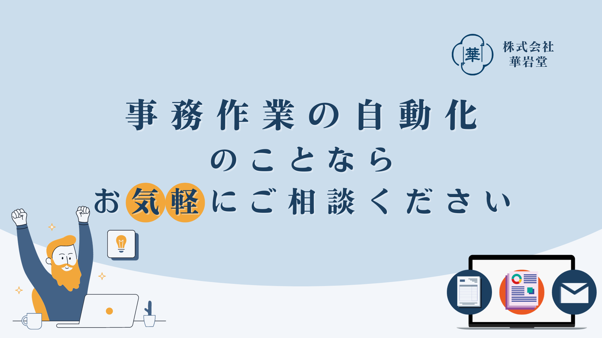 華岩堂では、業務効率化を支援するシステム開発を通じて、企業の「面倒な作業を終わりにする」お手伝いをしています。特に、業務の自動化やDX(デジタルトランスフォーメーション)推進をサポートするため、RPA(ロボティック・プロセス・オートメーション)を活用したソリューションを提供しています。